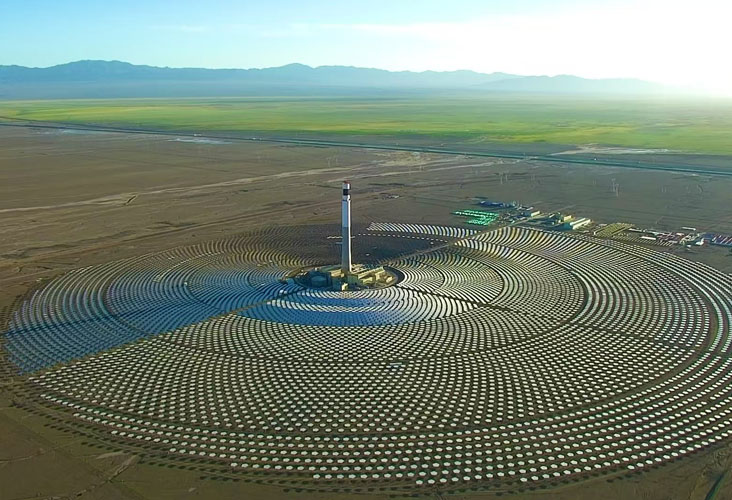 哈密光熱發(fā)電項(xiàng)目為國(guó)家第一批太陽(yáng)能熱發(fā)電示范項(xiàng)目之一,也是新疆首個(gè)建成并成功投運(yùn)的光熱項(xiàng)目。項(xiàng)目采用發(fā)電效率最高,技術(shù)最先進(jìn)的熔鹽塔式發(fā)電技術(shù),裝機(jī)容量50MWe,項(xiàng)目選用東方電氣高效率聚光集熱技術(shù),配置大容量、高參數(shù)儲(chǔ)熱系統(tǒng),可以實(shí)現(xiàn)24小時(shí)不間斷發(fā)電。